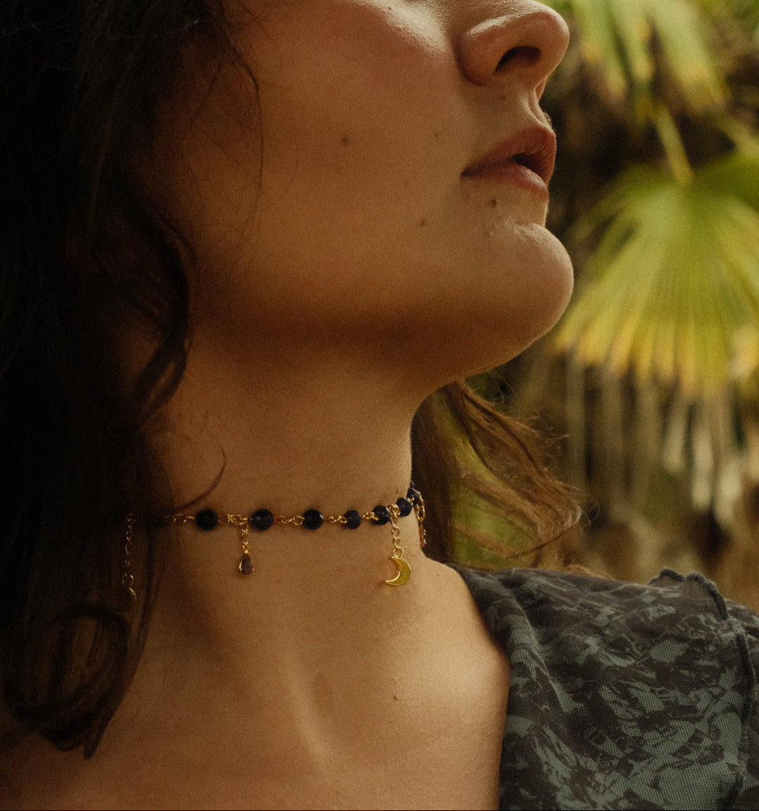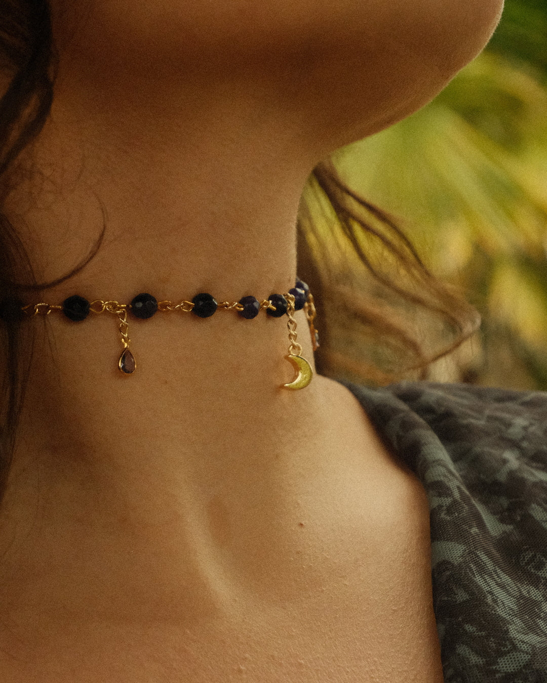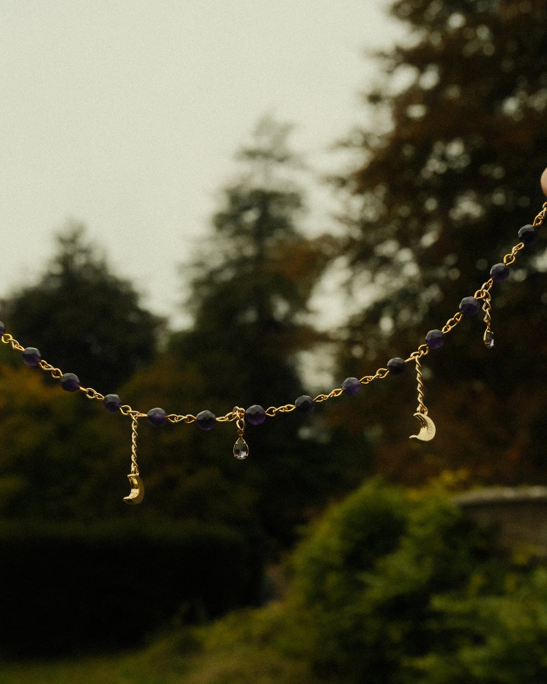 Capture the night’s magic with the Celestial Dreams Necklace, adorned with deep purple beads, and delicate moon and star charms. Suspended on a gold-toned stainless steel chain, this piece is a luminous tribute to the cosmos, perfect for dreamers and stargazers alike.