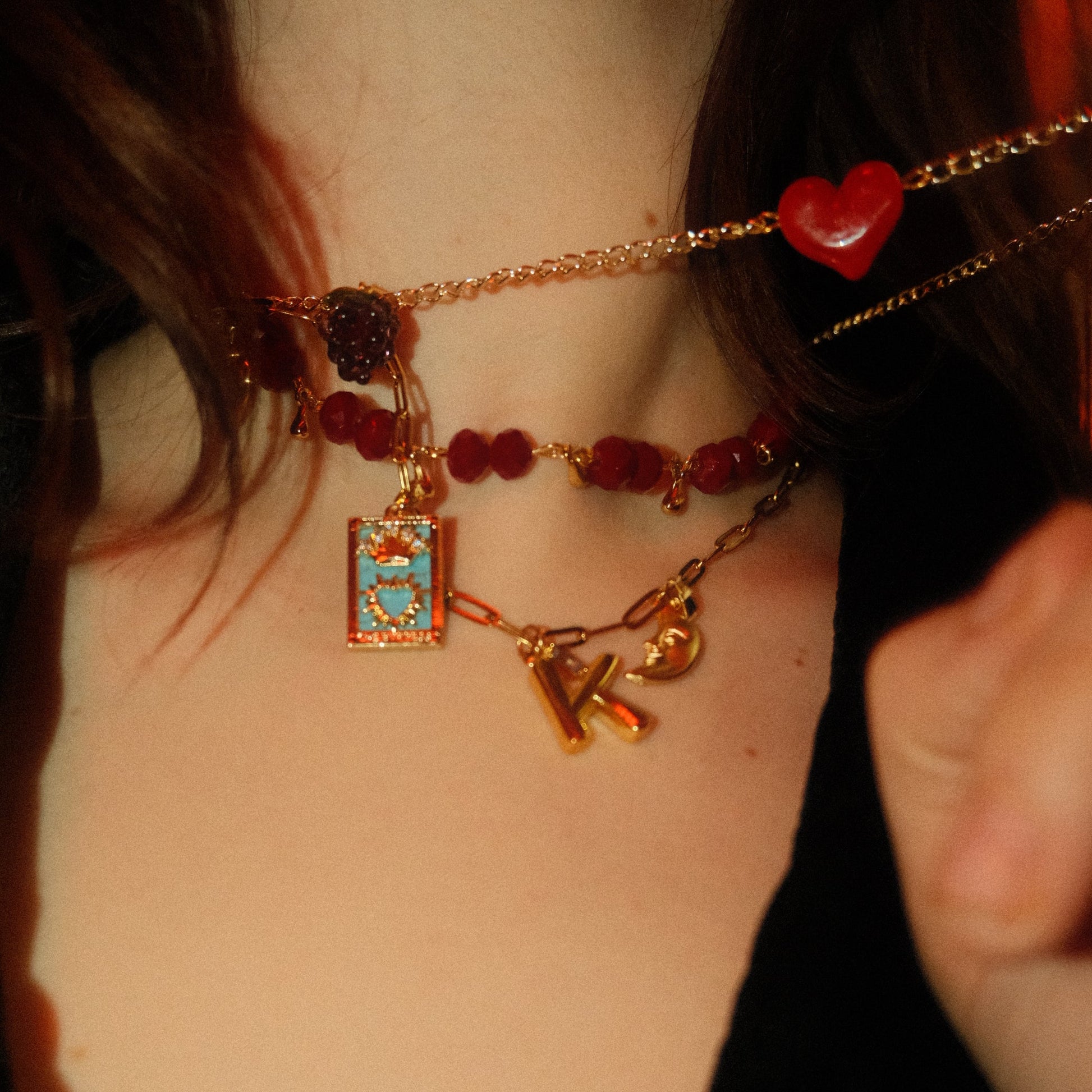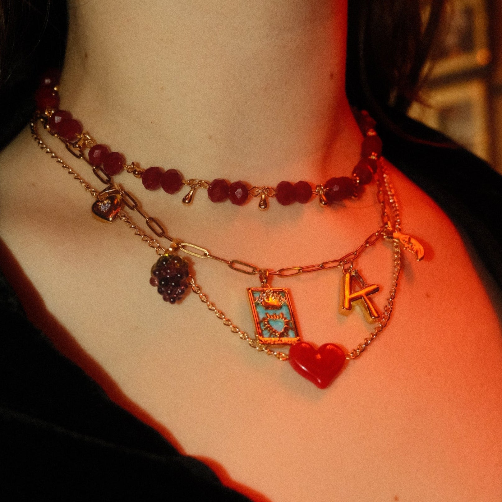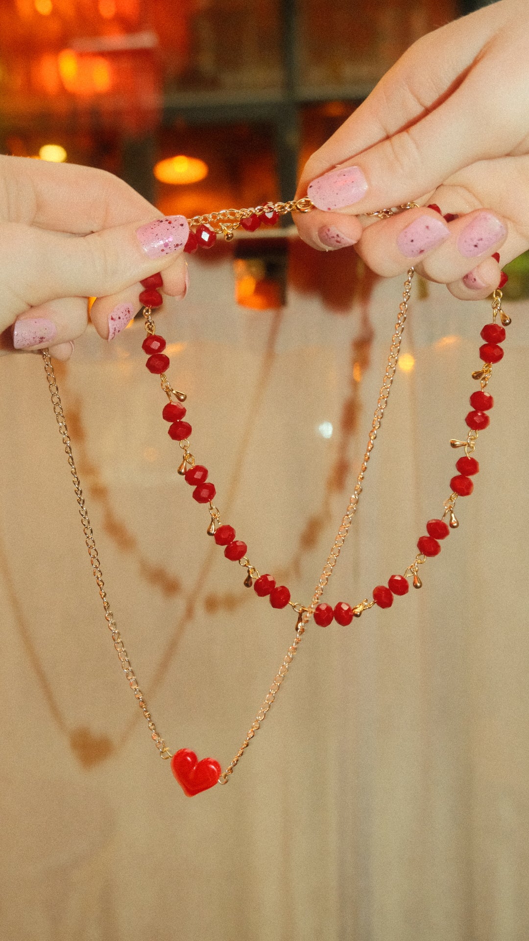 A delicate harmony of passion and grace, the Love Whispers Necklace features two layers—an elegant chain with a shimmering glass heart bead and a choker adorned with rich red beads. Designed to symbolize the quiet beauty of love, this piece adds a romantic touch to any look.