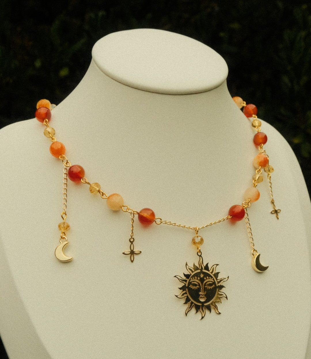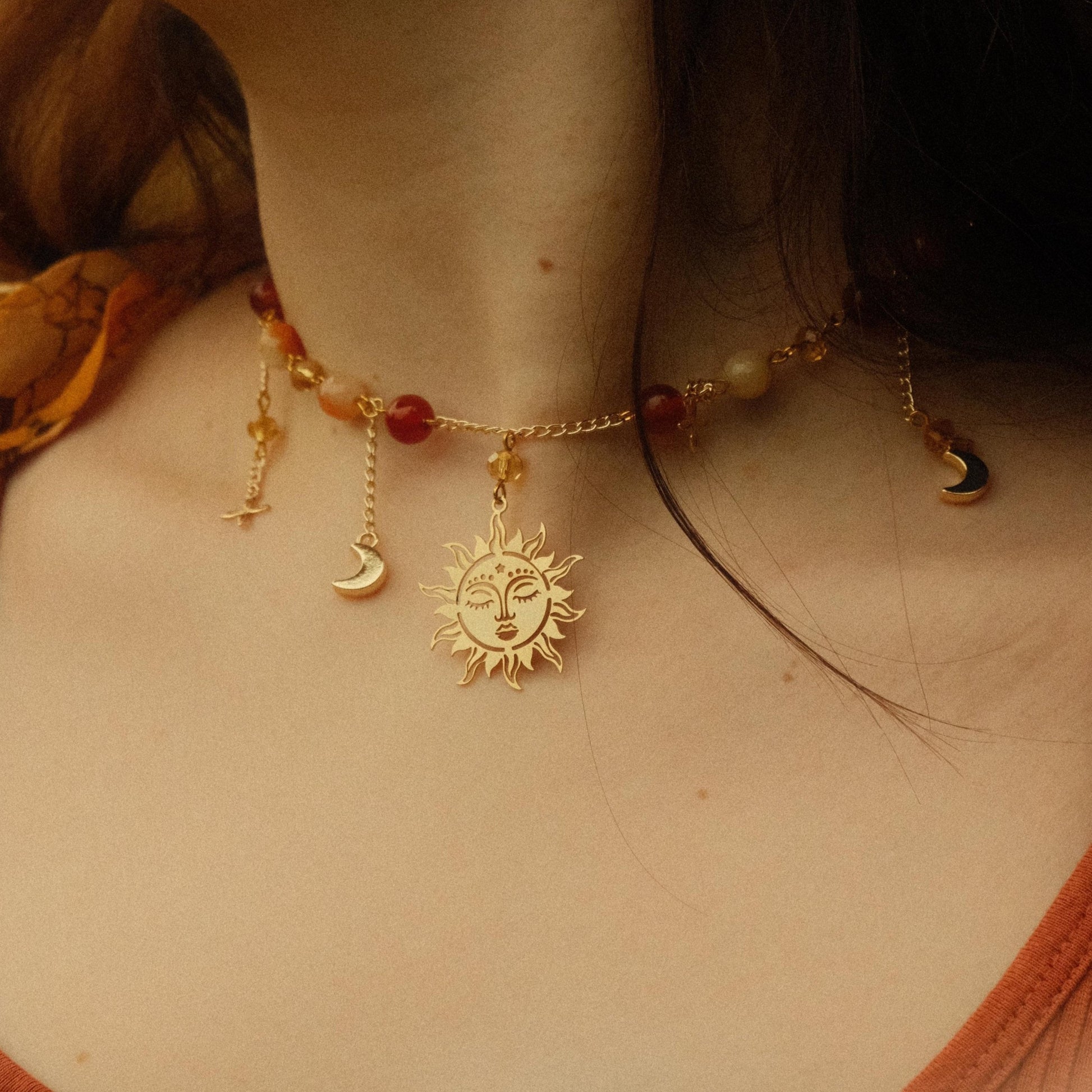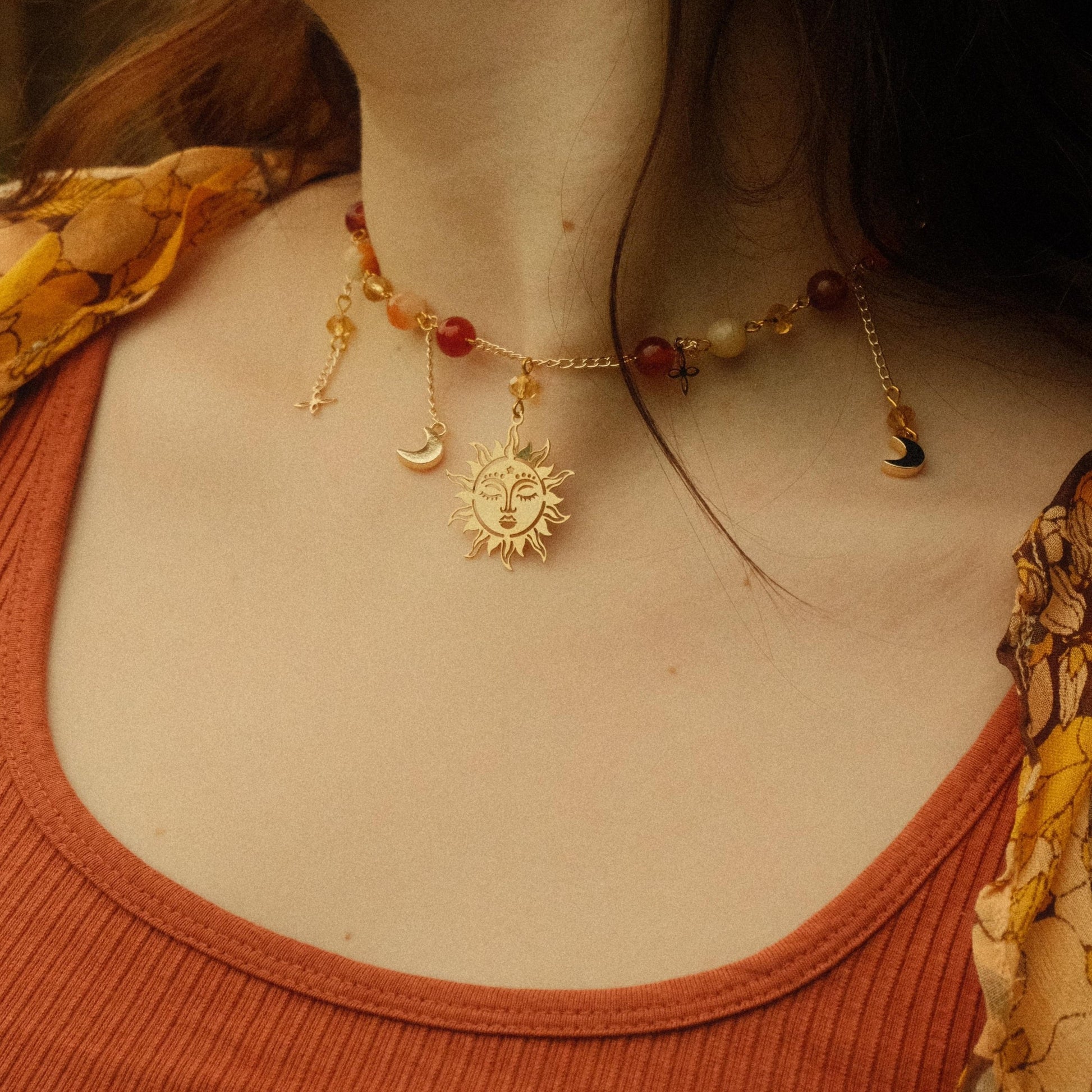 Radiate warmth and energy with the Solstice Harmony Necklace, a blend of earthy jade beads and a golden sun pendant that feels like a talisman of light. Suspended on a gleaming gold-toned stainless steel chain, this piece channels the spirit of sunlit days and hidden magic, bringing balance and vitality to every look.